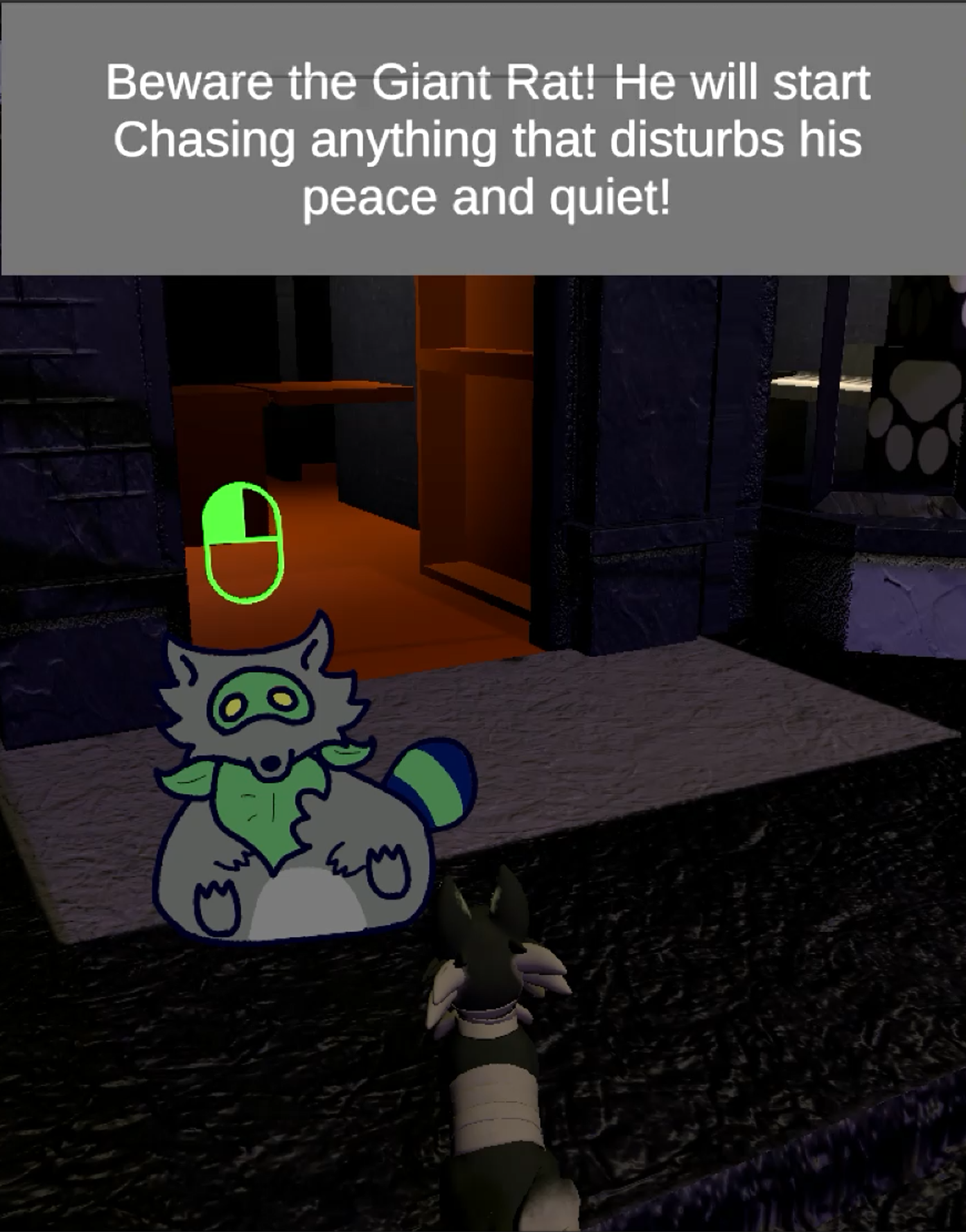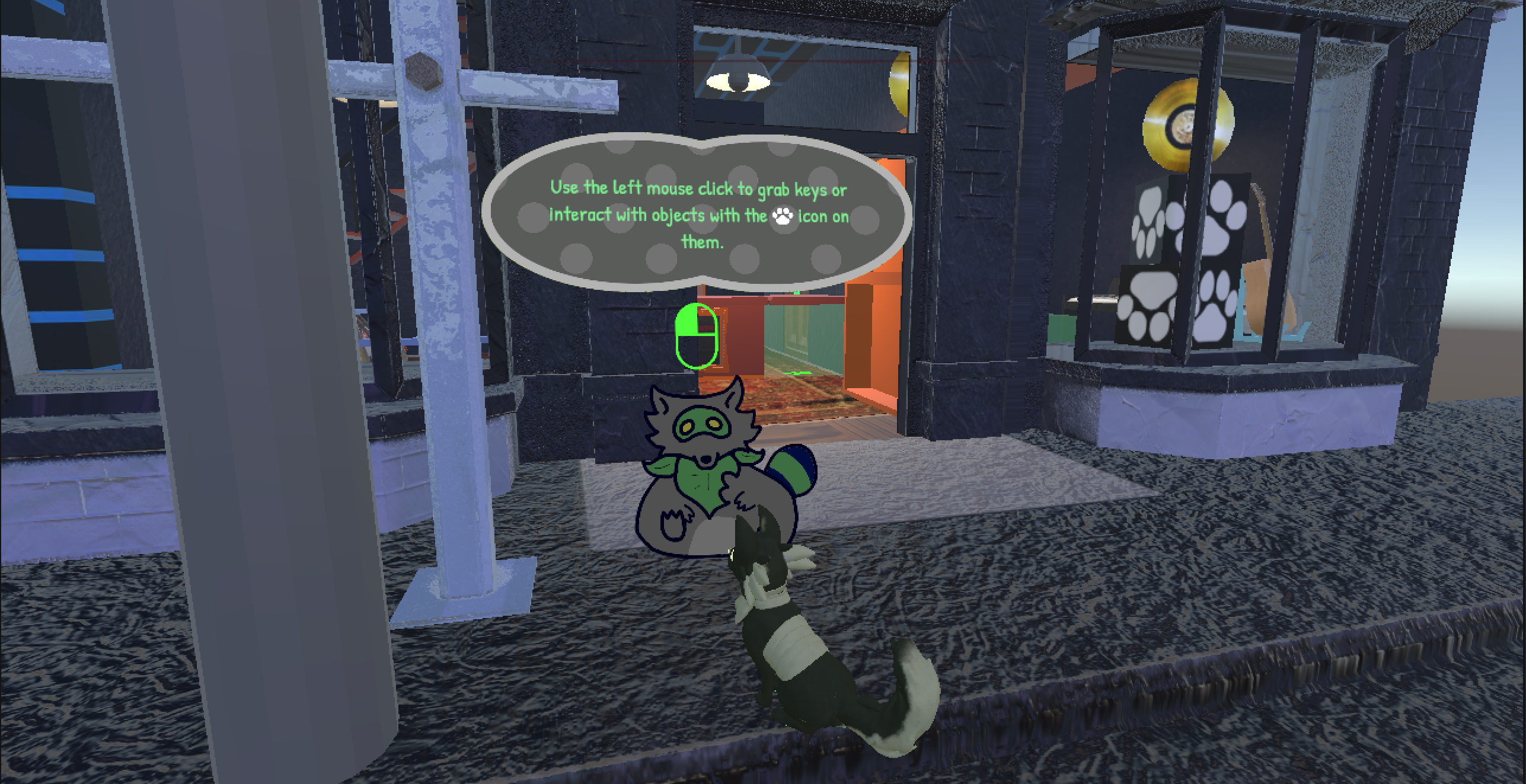 Rex the raccoon was added at the start of the game to help the player in response to the feedback we got from the playtester, when they played our game a second time. But we ran into another problem: they walked right past the raccoon, even when given a visual cue (Left-click icon) to talk to him. Our team brainstormed a few ideas to get the player to notice Rex the raccoon and we came up with some ideas like making him glow, giving him an outline or making him look brighter to catch the player's attention. We also decided to lock the front door, so the player has no choice but to talk to him. this worked well as our next playtester gave us some positive feedback on how noticeable Rex was!