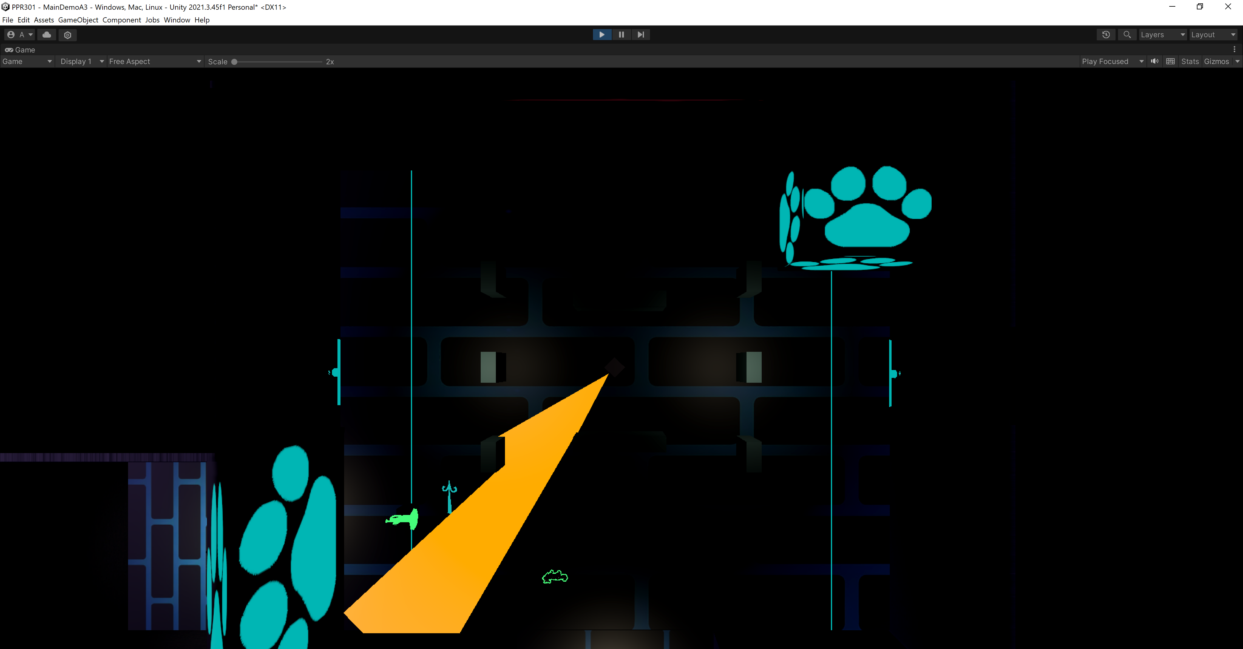 This was an old level design which was added in to give the player a hazard to avoid: The orange Lights! These lights act as security cameras that shifts from puzzle-solving to a more stealth-based aspect of the game. If the cat gets caught, the Rat King will appear! The player needs to cleverly use their memory to identify which areas are safe as the whole level is cloaked in darkness! Time your movement and race against the flashing lights or face the wrath of the Rat!! Thankfully, Rex the raccoon will help explain this to the player who is located next to a safe area to hide in.