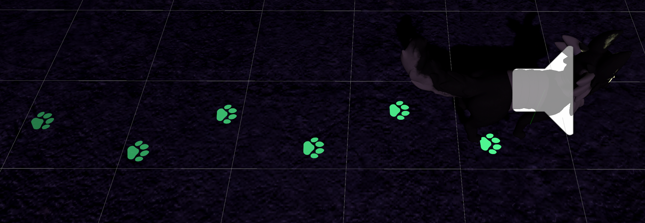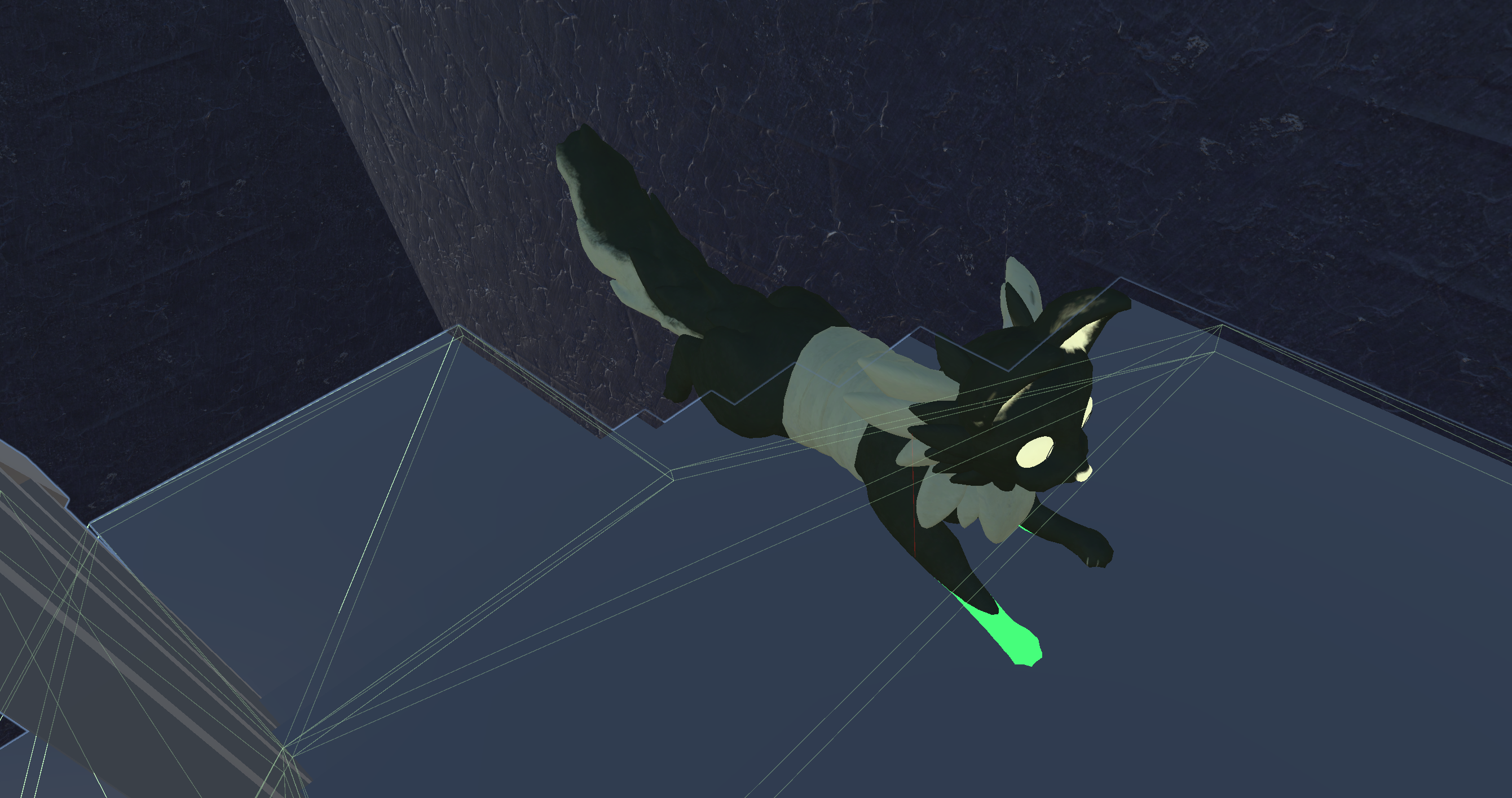 Fifth issue was the bright green paw prints that the cat was leaving on the ground. The paw feature is a charming addition to the cat's character, doubling as nice-looking detail and allows the player to see where they are going when the levels get dark. The paw placement looked weird while walking sideways and needed to be fixed to look more appealing. Luckily, Brooke made a new script that was meant for the mice. it was less convoluted and worked more effective than the old script. A new script was made for the cat using the code from the mice paw prints and modified a little so that the paws wouldn't show while jumping too. With a little modification of the variables, this fixed the issue nicely which looks better now.